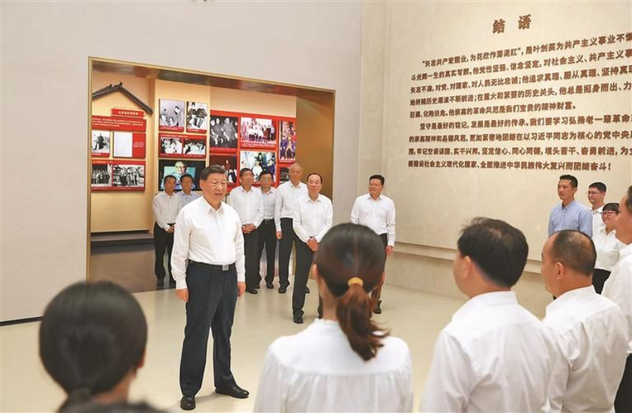 ཚེས ༧ ཉིན་གྱི་ཕྱི་དྲོར། ཞི་ཅིན་ཕིང་མེ་ཀྲོའུ་གྲོང་ཁྱེར་མེ་ཤན་ཆུས་ཡན་དབྱང་གྲོང་རྡལ་དུ་གནས་པའི་ཡེ་ཅན་དབྱིན་གྱི་དྲན་གསོ་ཁང་དུ་ཕེབས་ཤིང་། ཡེ་ཅན་དབྱིན་གྱི་དྲན་གསོ་ཁང་དུ། ཞི་ཅིན་ཕིང་གིས་ཡེ་ཅན་དབྱིན་གྱི་ཟངས་སྐུར་མེ་ཏོག་སི་ར་ཕུལ་ནས། ཡེ་ཅན་དབྱིན་གྱི་སྐུ་ཚེ་ཧྲིལ་པོའི་བྱས་རྗེས་འགྲེམས་སྟོན་ལ་གཟིགས་པ་དང་། དེ་རྗེས་ཡེ་ཅན་དབྱིན་གྱི་བཞུགས་གནས་རྙིང་པར་གཟིགས་སྐོར་གནང་ཞིང་། ཞི་ཅིན་ཕིང་གིས། ད་ཆ་ང་ཚོར་ཐོབ་པའི་གྲུབ་འབྲས་རླབས་པོ་ཆེ་དེ་དག་ནི་མའོ་ཙེ་ཏུང་སོགས་གསར་བརྗེ་པ་རྒན་རབས་ཚོས་བཙུགས་པའི་སྲིད་དབང་དང་བསགས་པའི་ཕ་གཞིས་ཀྱི་རྨང་གཞིའི་སྟེང་བཏོད་པ་ཞིག་རེད། ཏང་གི་ལོ་རྒྱུས་དྲིལ་བསྒྲགས་སློབ་གསོ་དང་ཟུང་འབྲེལ་བྱས་ཏེ། འབྱོར་མེད་གྲལ་རིམ་གྱི་གསར་བརྗེ་པ་རྒན་རབས་ཀྱི་གཏམ་རྒྱུད་ཡག་པོ་ཤོད་པ་དང་། རྒྱ་ཆེའི་ལས་བྱེད་མང་ཚོགས་དང་། ལྷག་པར་དུ་གཞོན་ནུ་ལོ་ཆུང་ཚོས་གསར་བརྗེའི་སྙིང་སྟོབས་རྒྱུན་འཛིན་དང་གསར་བརྗེའི་ཁྲག་རྒྱུན་རྒྱུན་མཐུད་ནས་ནམ་ཡང་ཏང་གི་བཀའ་ལ་ཉན་པ་དང་ཏང་གི་རྗེས་སུ་འབྲང་བར་སློབ་གསོ་ཁྲིད་སྟོན་བྱེད་དགོས་པའི་ནན་བཤད་གནང་བ་རེད།
