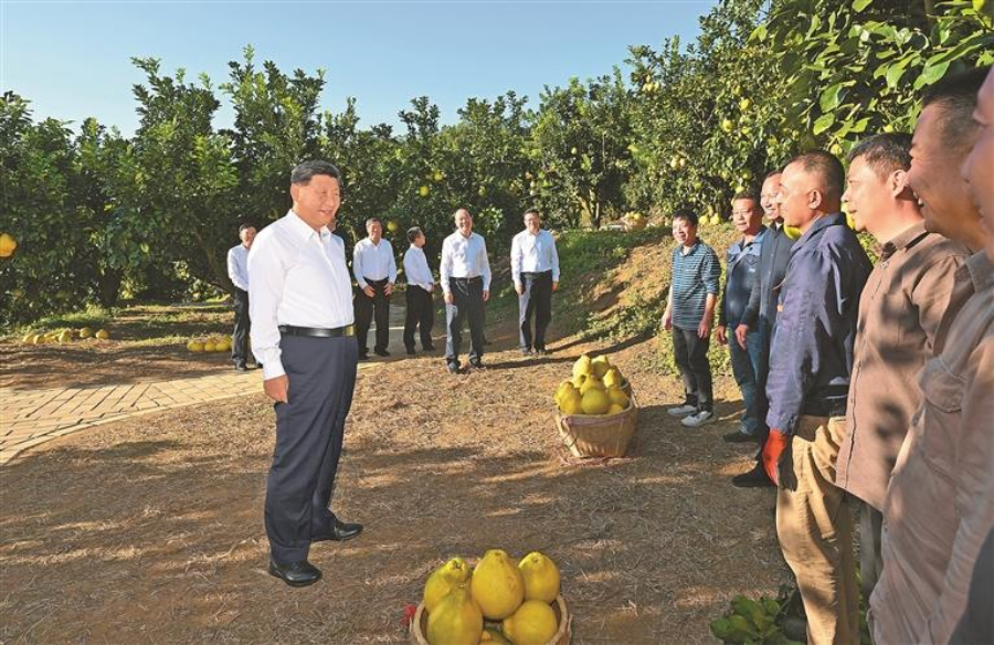 ཞི་ཅིན་ཕིང་ཡན་དབྱང་གྲོང་རྡལ་ནན་ཧྥུའུ་ཤིང་ཏོག་ཅིན་ཡིའུ་འདེབས་འཛུགས་རྟེན་གཞིར་ཕེབས་པ་དང་། དེ་གའི་འགྲེམས་སྟོན་ཁང་དུ་ཀོང་ཏུང་གིས་གསར་བརྗེའི་ཁུལ་རྙིང་པར་རྒྱབ་སྐྱོར་བྱེད་ཤུགས་ཆེ་རུ་བཏང་བ་དང་གྲོང་གསེབ་ཕྱོགས་ཡོངས་ནས་དར་རྒྱས་ཡོང་བར་སྐུལ་འདེད་བཏང་བ་སོགས་སྐོར་གྱི་སྙན་སེང་གསན་ཞིང་། ཤིང་ཏོག་ཡིའུ་ཙི་དང་དེ་བཞིན་ཤིང་ཏོག་ཡིའུ་ཙིའི་ལས་སྣོན་ཐོན་རྫས་དང་རིག་གནས་བསམ་བཀོད་ཐོན་རྫས་ལ་གཟིགས་ཞིབ་གནང་བ་དང་སྦྲགས། འབྲས་ཤིང་ར་བར་ཕེབས་ནས་ཤིང་འབྲས་འདེབས་མཁན་དང་ཞིང་ལས་ལག་རྩལ་མི་སྣ་དང་བྱམས་བརྩེའི་སྤེལ་རེས་ཀྱང་གནང་བ་རེད། ད་ལོ་ཤིང་ཏོག་ཅིན་ཡིའུ་ལ་ལོ་ལེགས་བྱུང་བའི་ཁར་ཚོང་ལམ་ཡང་ཡག་པོ་ཡོད་པ་མཁྱེན་རྗེས། ཞི་ཅིན་ཕིང་དགྱེས་ཚོར་ཆེན་པོ་བྱུང་ཞིང་། ཁོང་གིས། གྲོང་གསེབ་ཀྱི་ཁྱད་ལྡན་ཐོན་ལས་འཕེལ་རྒྱས་གཏོང་བ་ནི་གྲོང་གསེབ་ཕྱོགས་ཡོངས་ནས་དར་རྒྱས་འགྲོ་བར་སྐུལ་འདེད་གཏོང་བའི་རྨང་གཞི་ཡིན་པས། ཚན་རྩལ་བཀོལ་སྤྱོད་ལ་ཤུགས་སྣོན་རྒྱག་པ་དང་། ཞིང་ལས་དང་། རིག་གནས། ཡུལ་སྐོར་བཅས་མཉམ་འདྲེས་ལ་སྐུལ་འདེད་གཏོང་བ། ཐོན་ལས་འཁོར་འབྲེལ་རྒྱུན་ཆད་མེད་པར་སྣུར་སྲིང་དང་ཟུར་སྣོན་རིན་ཐང་མཐོ་རུ་གཏོང་བ་བཅས་བྱས་ནས་ཞིང་པ་མང་ཚོགས་དེ་བས་མང་བར་འབབ་འཕར་ཕྱུག་འགྱུར་ཡོང་བའི་སྐུལ་ཁྲིད་བྱེད་དགོས་ཞེས་གསུངས་པ་རེད།