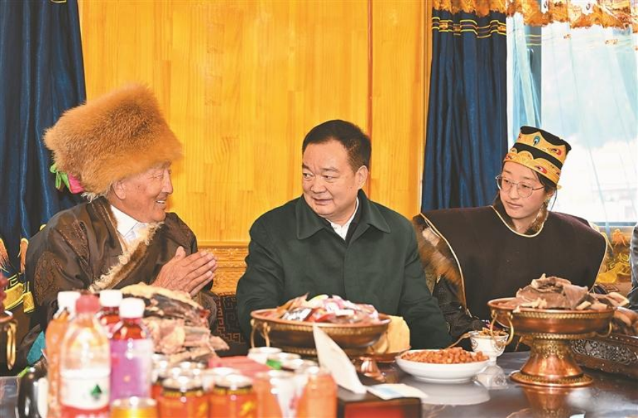 ཀྲུང་ཧྭ་མི་རིགས་ཀྱི་སྲོལ་རྒྱུན་དུས་ཆེན་དཔྱིད་གསར་དུས་ཆེན་འཆར་མ་ཐག་གངས་ལྗོངས་ས་མཐོར་བོད་ཀྱི་ལོ་གསར་ཤར་ཞིང་། ལོ་གསར་ཉིན་ཁྱིམ་ཚང་ཚང་མར་ལོ་གསར་བཀྲ་ཤིས་བདེ་ལེགས་ཞེས་པའི་སྨོན་ཚིག་བཟང་པོས་ཁེངས། ཁྱེད་ཚོ་ལོ་གསར་སྤྲོ་པོ་དང་། གཟུགས་པོ་བདེ་ཐང་། བཀྲ་ཤིས་བདེ་ལེགས་ཡོང་བའི་སྨོན་འདུན་ཞུ་རྒྱུ་ཡིན་ཝང་ཅུན་ཀྲེང་ཀླུ་ནང་གྲོང་རྡལ་བཀྲ་ཤིས་སྒང་གྲོང་ཚོའི་ལོ ༧༧ ལ་སླེབས་པའི་ཏང་ཡོན་རྒན་གྲས་དང་ཕྱུག་འགྱུར་སྣེ་ཁྲིད་པ་ཕུན་ཚོགས་ཀྱི་ཁྱིམ་དུ་ཕེབས་སྐབས། སྒོ་ཐོད་ཀྱི་ཤམ་བུ་གསར་པ་དང་། གཙང་ཞིང་གྲལ་འགྲིག་པའི་སྒོ་ར། བཀྲ་ཤིས་པའི་གྲོ་སོ་ཕྱེ་མར། དྲི་ཞིམ་འཐུལ་བའི་ཁ་ཟས་བཅས་ལོ་གསར་གྱི་རྣམ་པ་ཤིན་ཏུ་ཟབ་མོ་ཡོད་པ་གཟིགས། གཟུགས་གཞི་ཐང་པོ་བྱུང་ངམ་དང་དམངས་སྲོལ་གནས་ཚང་གི་ཚོང་ཡག་པོ་འདུག་གམ་གསུང་ནས་དྲོ་སོབ་སོབ་ཀྱི་ཚོམས་ཆེན་དུ་ཝང་ཅུན་ཀྲེང་གིས་བགྲེས་སོང་དང་ཅི་འཕྲོས་མོལ་འཕྲོས་གནང་བ་དང་། གཟུགས་པོའི་གནས་ཚུལ་དང་དེ་བཞིན་ཁྱིམ་ཚང་གི་ཡོང་འབབ་སོགས་ཀྱི་གནས་ཚུལ་བཀའ་འདྲི་གནང་རྗེས། ཕུན་ཚོགས་ཁྱིམ་གྱི་དམངས་སྲོལ་གནས་ཚང་དུ་ཕེབས་ཏེ་གོང་ཚད་དང་། ཞག་སྡོད་ཆ་རྐྱེན། ཁང་པའི་ཕྱི་རོལ་གྱི་མཛེས་ལྗོངས་བཅས་ལ་ཞིབ་པར་གཟིགས་པ་རེད། བློ་མཐུན་ཞི་ཅིན་ཕིང་གིས་སྲོག་ཤིང་གནང་བའི་ཏང་ཀྲུང་དབྱང་གི་བྱམས་བརྩེའི་ཐུགས་ཁུར་འོག་བཀྲ་ཤིས་སྒང་གྲོང་ཚོར་གནམ་ས་བླ་འོག་ཏུ་འགྱུར་བ་ལྟ་བུའི་འགྱུར་ལྡོག་བྱུང་བ་དང་། ཕུན་ཚོགས་ཁྱིམ་གྱིས་ཡུལ་དེ་གའི་ཡུལ་སྐོར་ཐོན་ཁུངས་ལ་བརྟེན་ནས་དམངས་སྲོལ་གནས་ཚང་དང་བཟའ་བཏུང་ལས་རིགས་གཉེར་བར་ལོའི་ཡོང་འབབ་རྒྱུན་ཆད་མེད་པར་མང་དུ་ཕྱིན་པ་དང་འཚོ་བ་ཇི་ཙམ་བསྐྱལ་བ་དེ་ཙམ་གྱིས་ཡག་ཏུ་ཕྱིན་པ་མཁྱེན་སྐབས། ཝང་ཅུན་ཀྲེང་དགྱེས་ཚོར་ཆེན་པོ་བྱུང་བ་དང་ཁོང་ཚོའི་བདེ་སྐྱིད་ལྡན་པའི་འཚོ་བར་བསྔགས་བརྗོད་གནང་ཞིང་། ཁོང་གིས་བྱང་སྐར་སྤུན་བདུན་གྱི་ལམ་སྟོན་ཇི་བཞིན་བསྐྱོད་ན་ལམ་ནོར་ཐེབས་མི་སྲིད་པ་དང་གུང་ཁྲན་ཏང་གི་རྗེས་སུ་འབྲངས་ན་བདེ་སྐྱིད་ཐོབ་ངེས་ཡིན། བདེ་སྐྱིད་ལྡན་པའི་འཚོ་བར་རོལ་རྒྱུ་བྱུང་བ་དེ་བློ་མཐུན་ཞི་ཅིན་ཕིང་གིས་སྲོག་ཤིང་གནང་བའི་ཏང་ཀྲུང་དབྱང་གིས་བོད་ཀྱི་ལས་དོན་ལ་ཚད་མཐོའི་མཐོང་ཆེན་དང་བོད་ཀྱི་མི་རིགས་ཁག་གི་མི་དམངས་ལ་ཐུགས་ཁུར་ཟབ་མོ་གནང་བ་དང་ཁ་འབྲལ་ཐབས་མེད། ཚང་མས་སྤྱི་ཁྱབ་ཧྲུའུ་ཅིའི་བཀའ་དྲིན་ཚོར་བ་དང་ཏང་ཀྲུང་དབྱང་ལ་ཐུགས་རྗེ་ཆེ་ཞུས་ཐོག་སྔར་བས་བློ་བརྟན་འགྱུར་མེད་ངང་ཏང་གི་བཀའ་ལ་ཉན་པ་དང་། ཏང་གི་བཀའ་དྲིན་ཚོར་བ། ཏང་གི་རྗེས་སུ་འབྲང་བ་བཅས་བྱེད་དགོས། ཏང་ཡོན་གྱིས་གདོང་ལེན་དཔེ་བཟང་གི་ནུས་པ་འདོན་པ་དང་ཏང་གི་གཟི་བརྗིད་སྲོལ་རྒྱུན་